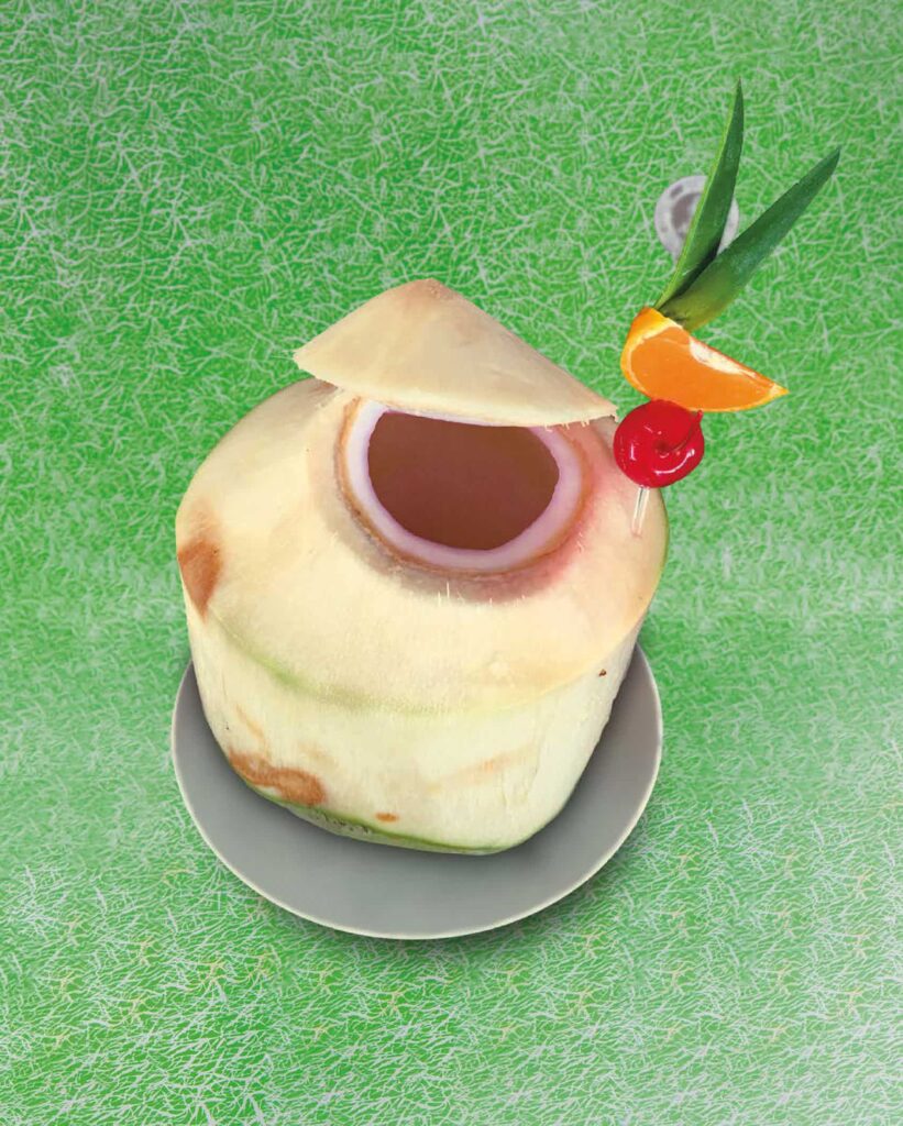 JUST before serving, add all the ingredients to a high-powered blender and blend until smooth. Serve immediately in an empty green coconut or glass.