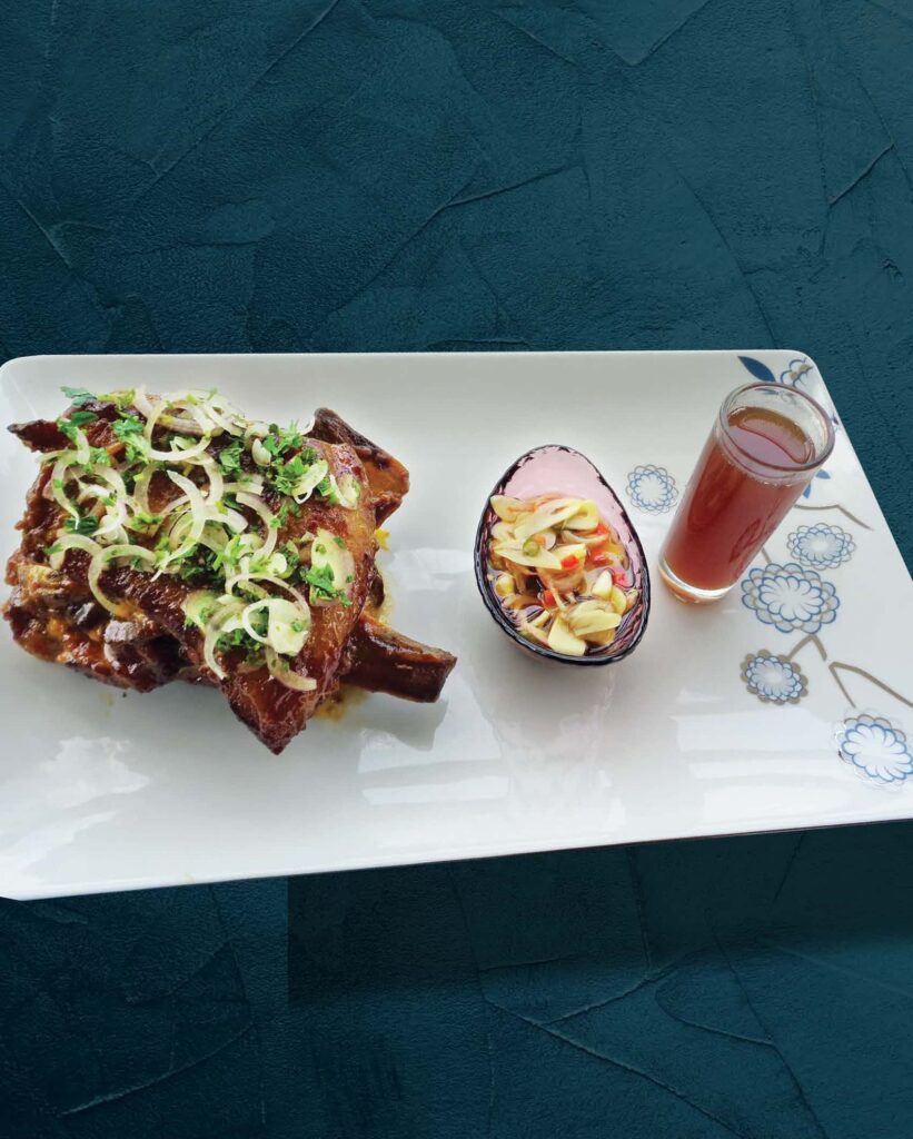 PLACE the rib on a serving plate and drizzle with some of the sweet dressing. Serve with the said ingredients.