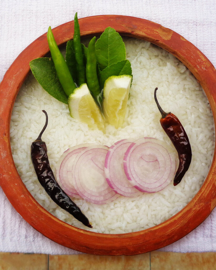 “ Panta Bhat Is a rice-based dish prepared by soaking cooked rice in water at room temperature overnight. Care must be taken to cover the dish during the long soaking period to avoid conatmination. Traditionally, it’s served in the morning with some salt, raw onion, green chillies, and fried red dry chillies. It is consumed in rural areas in Bangladesh. A very popular dish on the day of Pahela Baishakh/ Benaali New year. There are many variations of the dish. The fluid portion is called amani or torani. ”