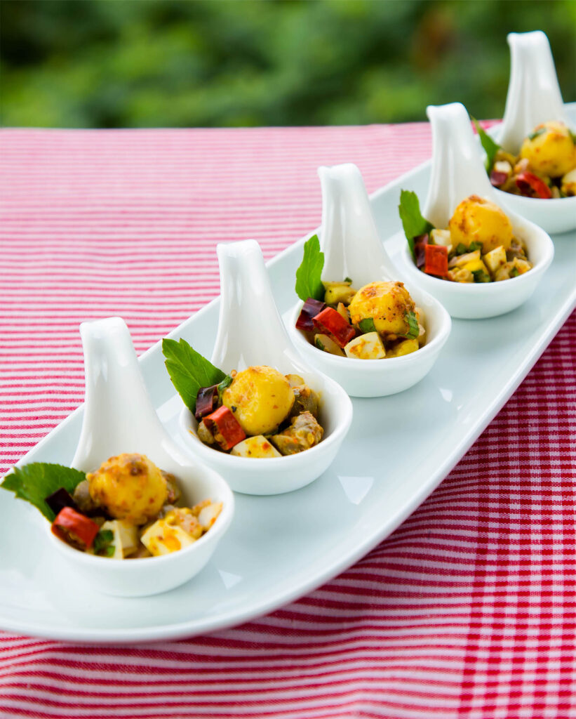250 g tiny new potatoes 150 g chicken gizzards 2 chicken eggs ½ teaspoon ginger paste ½ teaspoon garlic paste 2 teaspoons salt ¼ cup spring onion, cut into thin rounds ¼ cup sawtooth coriander, chopped 2 teaspoons dry roasted chilli powder 2 tablespoons mustard oil 1 tablespoon lemon juice