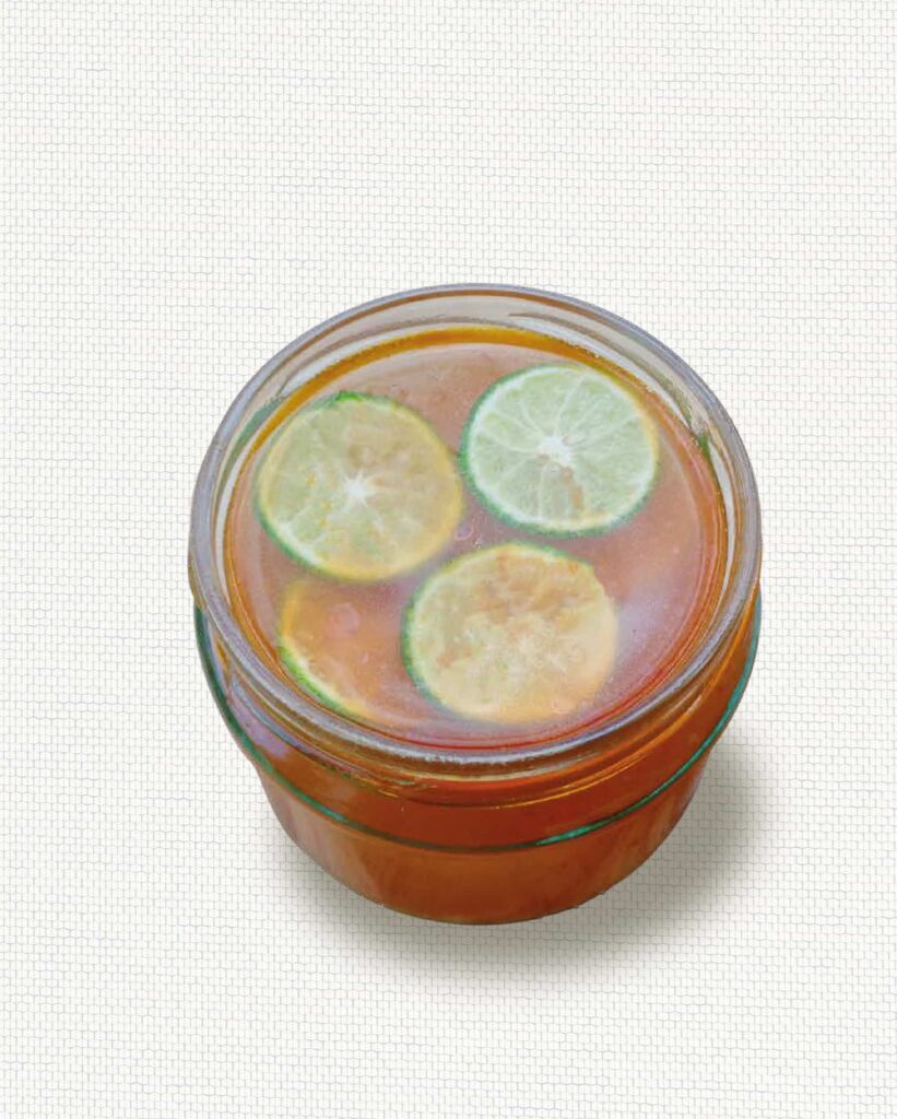 STRAIN, discard the bones and head. Add the grape juice, lemon juice, and Thai chilli paste, mix well, cool, and refrigerate.