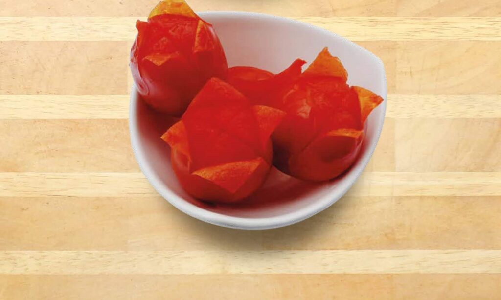 ADD the tomatoes to the boiling water for 20 to 30 seconds, once the skin begins to wrinkle, use a slotted spoon or a strainer to strain the tomatoes and transfer them to the bowl of iced water to cool. Once cooled, peel off the skin, then use as desired.
