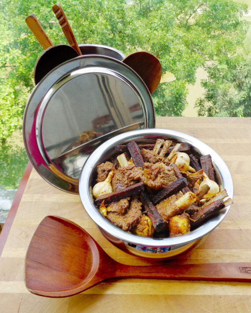 ONCE the water has evaporated and the meat has been well incorporated with the spices, add hot water, cover, and cook over low heat until the meat is tender. Add the whole garlic bulbs, cover and cook for 5/6 minutes. Add the chuijhal, sprinkle the special spice powder, cover and cook for 6 minutes. When the oil starts collecting at the edges of the mutton remove from the heat. Taste and adjust the seasoning. Sprinkle with caramelised onion and remove from heat.