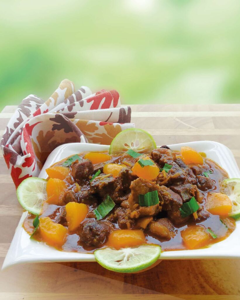 SPRINKLE the powder of cardamom, cinnamon, roasted pepper, and clove. Add apricot and lemon to the pot. Cover and simmer for about 5 minutes, until the liquid has thickened. Taste and adjust the seasoning. Remove from heat and sprinkle with sawtooth coriander. Serve with any kind of pulao.