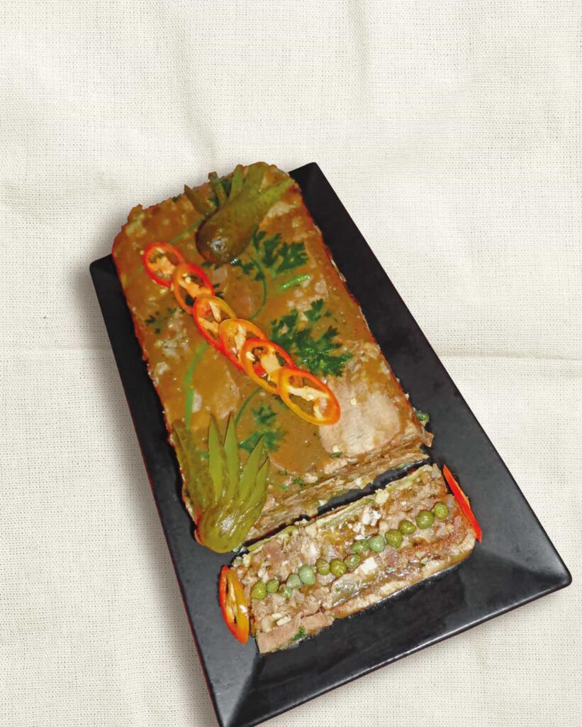 ADD the cut pieces into the broth and stir well. Pour everything into a rectangular mould and place the head cheese in the refrigerator for at least 6 hours to allow the head cheese to cool down and gelatinise. Once firm, the head cheese can be removed from the mould and sliced into desired pieces.
