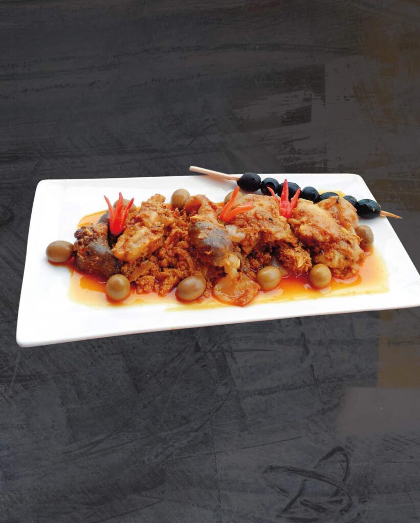 HEAT oil in a wok, add onion, garlic, and green chillies. Stir fry until light golden brown. Add all the ingredients from dry chilli powder to salt. Add the fish eggs and cook for 5 minutes, and then add the fish guts, and mix well. Pour in ½ cup water, cover, and cook on medium heat for 7 minutes. Add the green olives and cook for 2 minutes. Taste and adjust the seasoning. Serve with black olives and chillies. Enjoy with steamed rice.