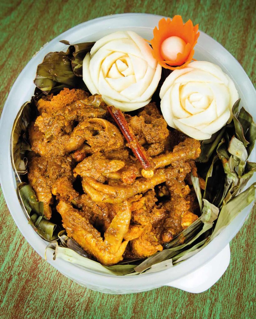 PLACE the chicken curry in the middle of the banana leaves, cover and secure with toothpicks. Arrange a char grill and cook the banana leaves pouch for 1 hour or until the chicken is tender. This is a very spicy dish. Serve with steamed rice.