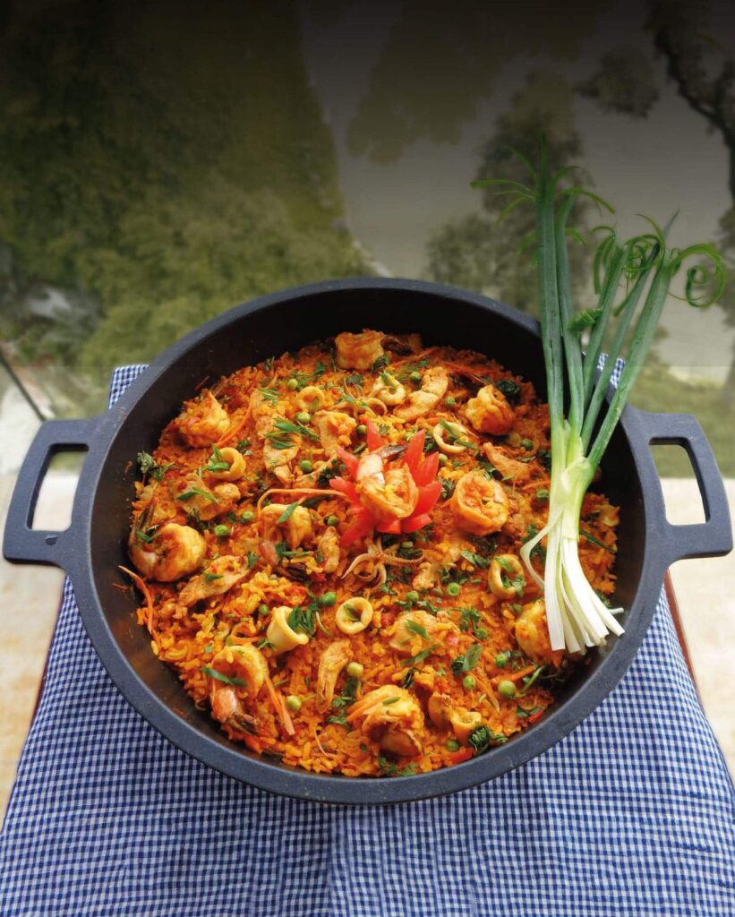 UNCOVER the paella pan, and spread boiled peas, carrots, chicken, and seafood over the rice, pushing it into the rice slightly. Add the grape juice and lemon juice. Cover and cook for another 5-6 minutes on medium heat. Remove from heat, and sprinkle the roasted capsicum, spur chillies, capers, coriander leaves, and spring onions. Serve the paella pan straight from the stove to the dining table.
