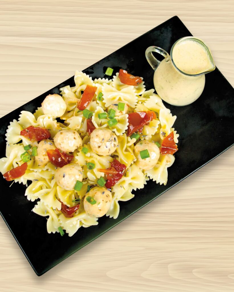 IN a serving dish, spread pasta, add the chicken balls, and pour half of the sundried tomato sauce. Extra sauce can be served in a glass jug. Serve immediately.