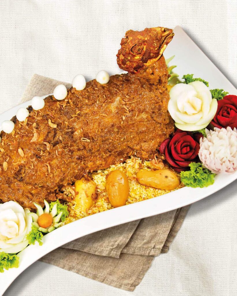 4 cups oil 2 kg whole potatoes, peeled and soaked in water 5 kg whole mutton, cleaned, washed, and drained 3 cups ghee/clarified butter ¾ cup ginger, paste 2 tablespoons garlic paste 3 cups sour yoghurt 2 tablespoons salt 1-litre mutton feet stock 4 cups of caramelised onions Kacchi biriyani spice powder, use the whole amount prepared (page 356) 20 alubokhara/dried plums 2 tablespoons rose water 2 tablespoons kewra water 500 g wheat flour (make a dough to seal the lid of the pan) 10 chicken eggs, boiled (optional)