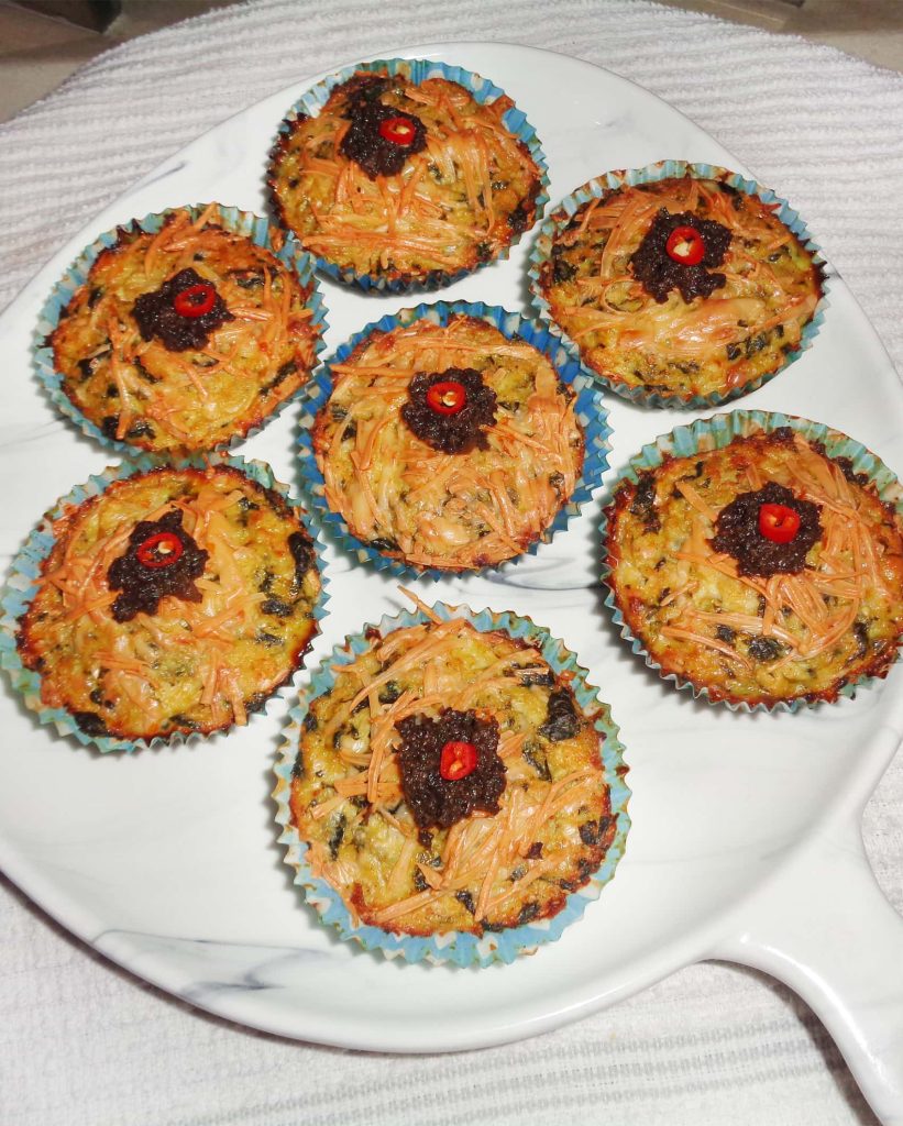 700 g cauliflower, grated 200 g chicken, boiled and shredded 100 g baby spinach, washed and chopped 1 tablespoon onion powder 5 chicken eggs, beaten 1 tablespoon garlic powder 1 cup shredded cheddar cheese 1 teaspoon baking powder 1 tablespoon mint, chopped 2 teaspoons salt ½ teaspoon cayenne pepper ¼ teaspoon freshly cracked black pepper Cooking spray SERVE with, sauted black truffle and red chilli.
