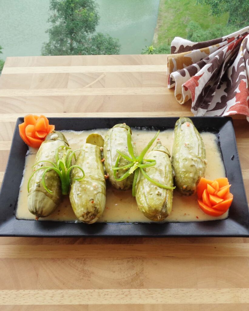 ONCE the gourds are cool enough to handle, stuff the shrimp mixture generously. Push the stuffing gently with your fingers to make it tight. Otherwise, it might fall out while cooking. Close the opening with the top part of the gourd with toothpicks.