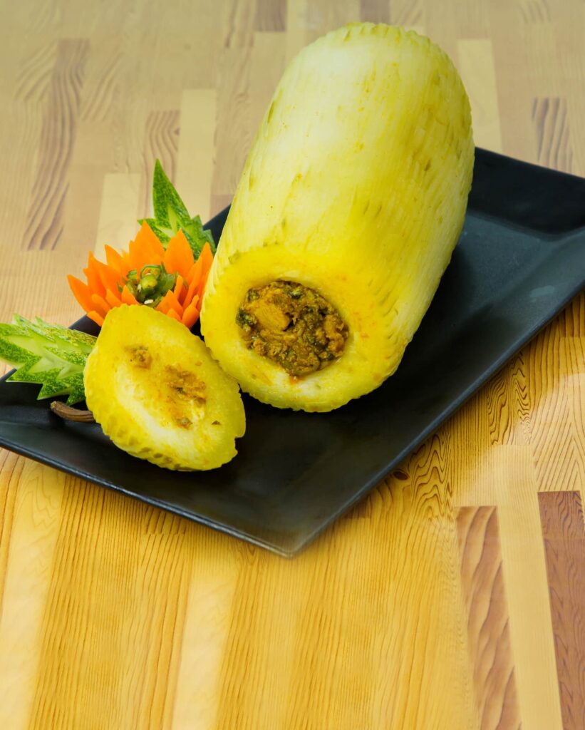 IN a wok, add 2 tablespoons of oil and fry the gourd on all sides for 2-3 minutes. Remove and stuff the gourd with the chicken stuffing. Secure the top part with toothpicks. Heat water in a steamer and steam the stuffed gourd for 30 minutes or until tender. Remove and serve hot.