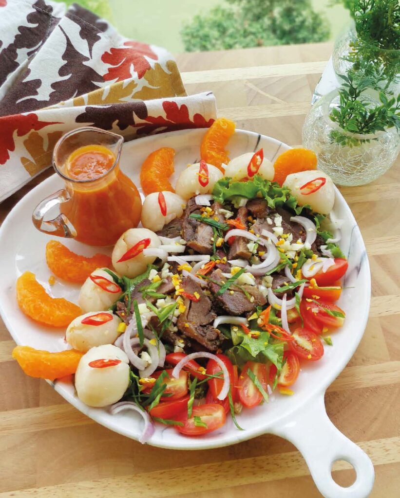 TOSS with lychees, tomatoes, sawtooth coriander, spring onion, and shallot. Taste and adjust the seasoning.
