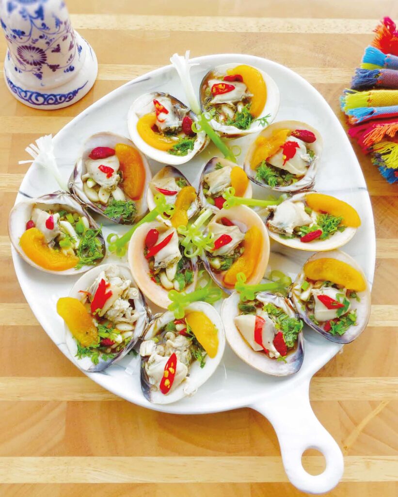 2 kg quahog clam ¼ cup salt + 1-litre warm water 2 tablespoons lemon juice 2 tablespoons fish sauce 1 ½ tablespoons palm sugar 2 tablespoons garlic, minced 8 red birds’ eye chillies, thinly sliced 2 tablespoons sweet ginger pickle 2 tablespoons capers