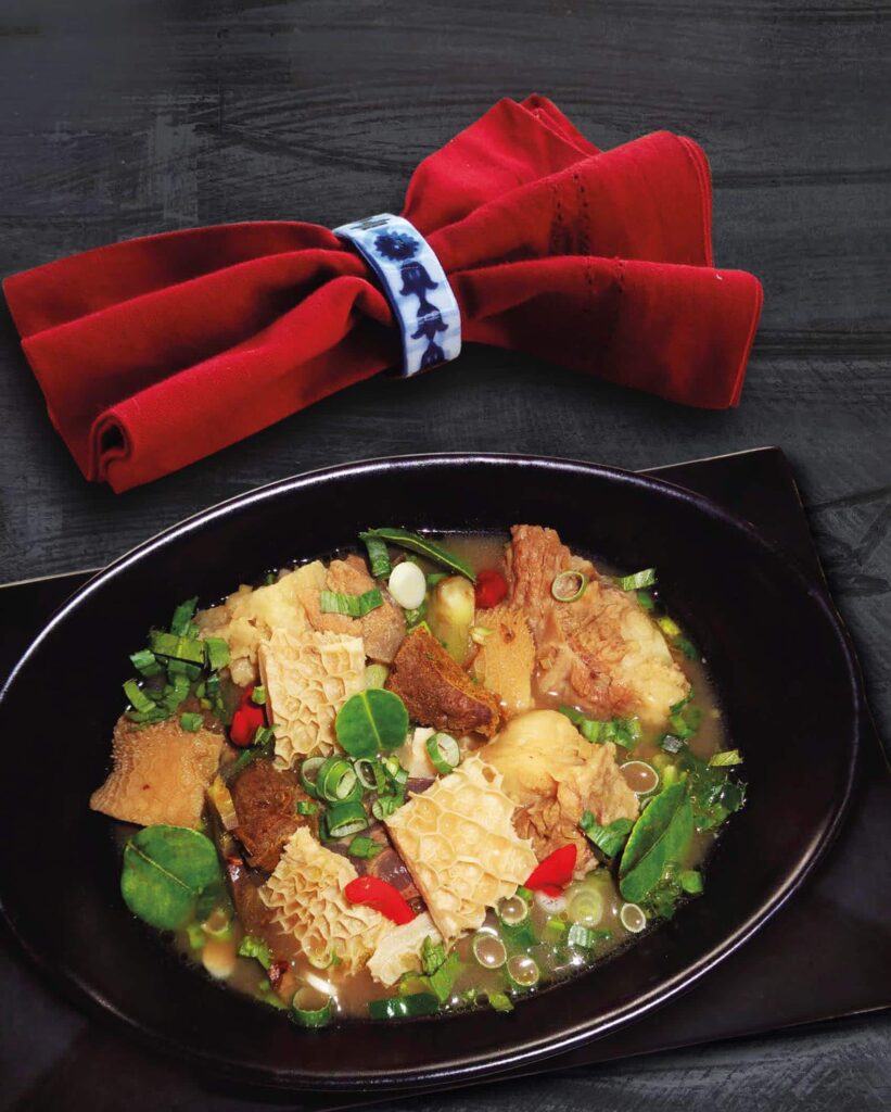 2 teaspoons salt 100 g beef spleen 100 g beef kidney 2 teaspoons white birds’ eye chilli paste (page 351) 2 tablespoons oil , for frying 3 cups water 200 g beef tripe 6 cloves ¼ cup sun-dried tomatoes, halved, oil reserved 1 tablespoon sun-dried tomato oil 6 champignon mushroom, halved 3 cups water 1 tablespoon galangal, minced 4 lemongrass stalks, minced 4 garlic cloves 2 cups hoofs stock (page 348) 8–10 kaffir lime leaves 1 tablespoon fish sauce ¼ cup chopped sawtooth coriander ¼ cup spring onion, cut into 2-inch-long pieces 6 birds’ eye chillies