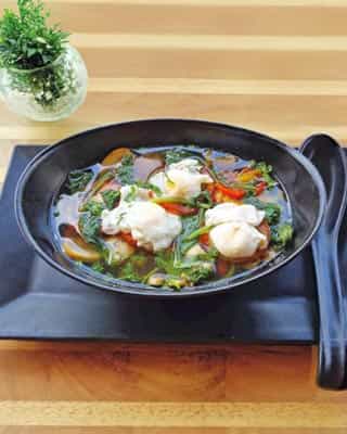 SIMMER the soup with mirin, apple cider vinegar, and salt on low heat for 5 minutes. Taste and adjust the seasoning. Ladle the soup into bowls, and add the fried chicken, and spring onions. Serve hot.