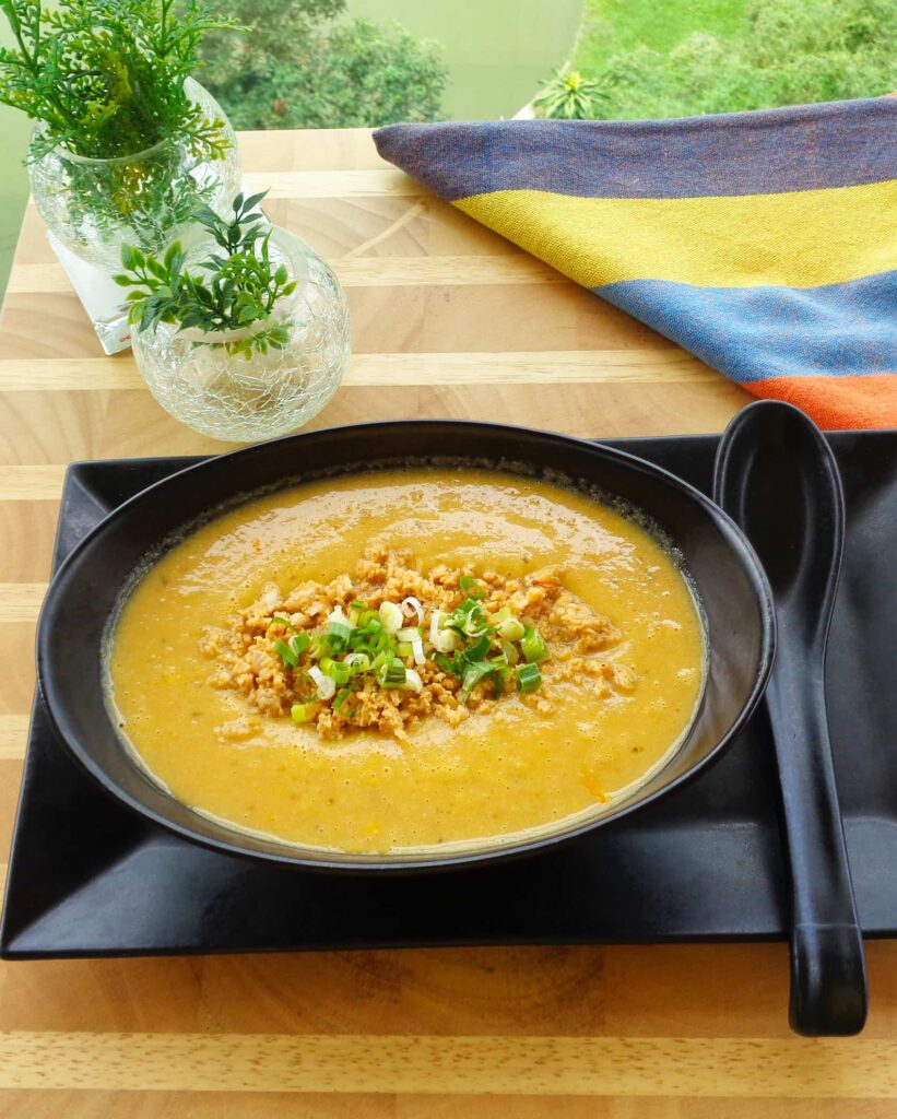 SPRINKLE garlic powder and top up with the chicken stock. Once the stock starts boiling, add the goji berries. Simmer for 45 minutes over low heat. Once the potatoes are very soft, add the kaffir lime leaves. Transfer to a blender to purée the soup. Pour back again into the soup pot.