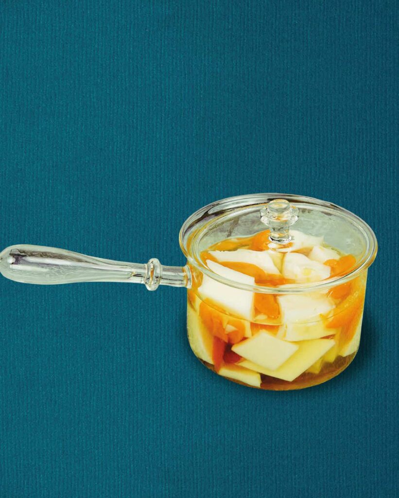 TO serve, fill a bowl with almond jelly and apricot syrup, and top with crushed ice. Serve immediately.