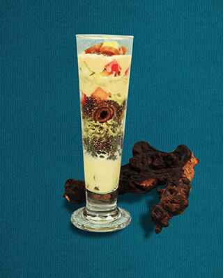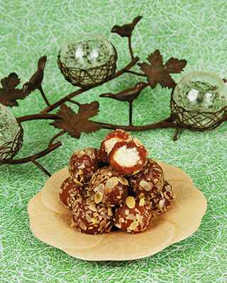 ALMOND JELLY: Mix all the ingredients except the crushed nuts into a pot, and simmer until agar-agar powder completely dissolves. Remove from the heat and strain through a sieve. Add the almond, mix and pour onto a small pan. Chill in the refrigerator for 30 minutes. Cut the almond jelly into small pieces.