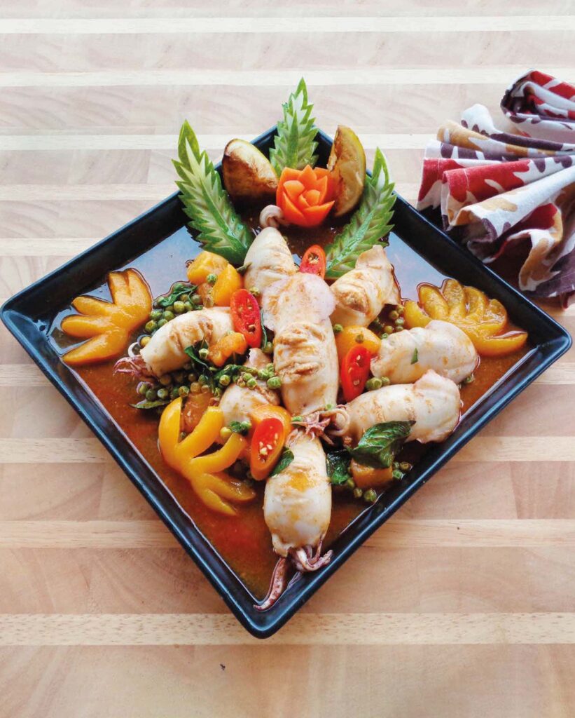 COOK until the sauce reduces to half, add the steamed squid, red spur chilli, kaffir lime, basil leaves, and apricots. Cook on high heat for 2 minutes. Taste and adjust the seasoning, and remove from heat. Garnish and serve with steamed rice.