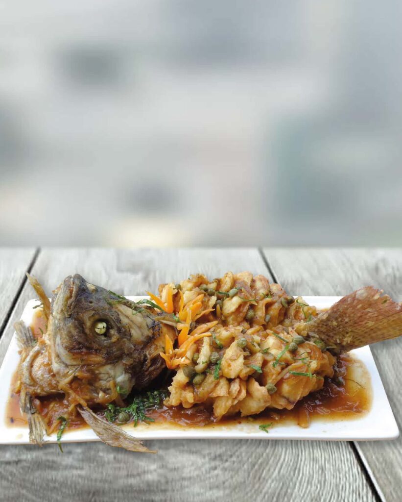 HEAT 3 cups of oil until 180ºC. Use an oil thermometer to check. Hold the fish from its tail upright over the wok, scoop some hot oil, and gently pour it on the sides of the fish making sure it runs through the crevices. Do this multiple times until the fish holds its shape. Now submerge the fish in hot oil, deep fry until golden brown and crispy on the outside and soft inside. Fry the fish head separately.